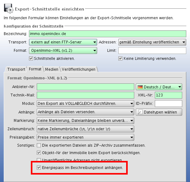 Um eventuellen Abmahnungen vorzubeugen sollte jedes belieferte Portal sicherheitshalber auf korrekte Darstellung des Energiepasses geprüft werden. Falls die Angaben nicht korrekt dargestellt werden, sollten Sie den Portalbetreiber darüber in Kenntnis setzen und um Korrektur bitten. Als Übergangslösung können Sie dann in der Schnittstelle im ImmoTool die Option "Energiepass im Beschreibungstext anhängen" aktivieren und nochmals einen Export im Vollabgleich durchführen.