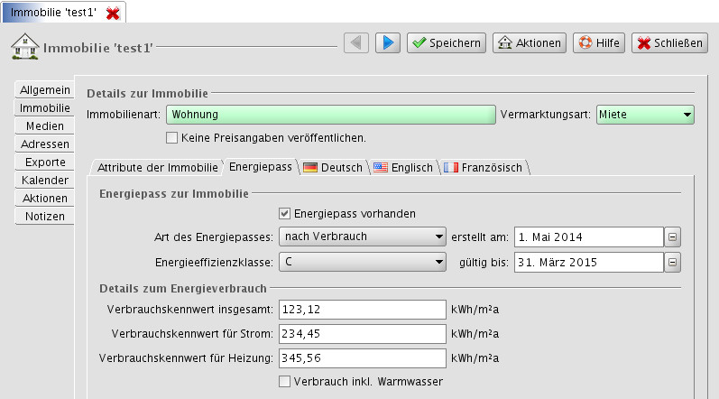 Im Immobilienformular wurde ein weiterer Reiter namens "Energiepass" eingefügt. In diesem Formular könne alle für den Energiepass relevanten Angaben erfasst werden. Abhängig von der Art des Energiepasses werden unterschiedliche Eingabefelder dargestellt. Bitte beachten Sie, dass nicht in jedem Falle alle Eingabefelder zwingend ausgefüllt werden müssen. Gemäß EnEV 2014 müssen unter bestimmten Umständen auch das Baujahr der Immobilie sowie die Heizungsart / Befeuerung zwingend angegeben werden (siehe Pflichtangaben in Immobilienanzeigen). Diese Angaben können weiterhin an der altbekannten Stelle im Programm erfasst werden.
