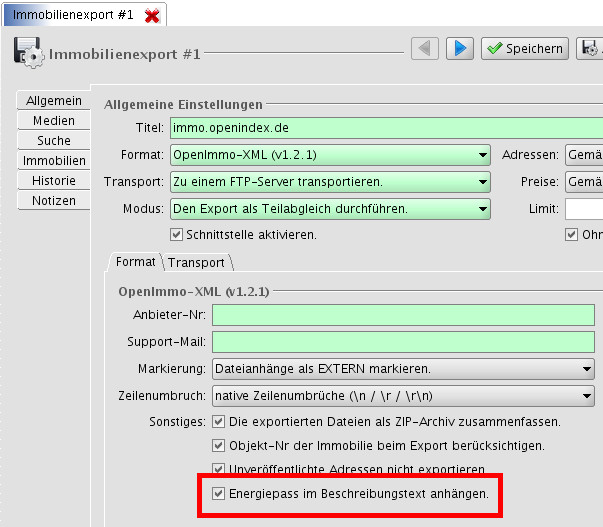 Um eventuellen Abmahnungen vorzubeugen sollte jedes belieferte Portal sicherheitshalber auf korrekte Darstellung des Energiepasses geprüft werden. Falls die Angaben nicht korrekt dargestellt werden, sollten Sie den Portalbetreiber darüber in Kenntnis setzen und um Korrektur bitten. Als Übergangslösung können Sie dann in der Schnittstelle im ImmoTool die Option "Energiepass im Beschreibungstext anhängen" aktivieren und nochmals einen Export im Vollabgleich durchführen.