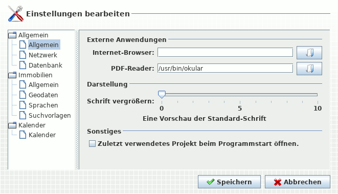 Im Einstellungs-Fenster (zu finden unter Hauptmenü » Extras » Einstellungen) kann nun die Standard-Schriftgröße im Programm durch einen Schieberegel um maximal 10 Stufen vergrößert werden. Nachdem die Schriftgröße geändert wurde muss das Programm neu gestartet werden.