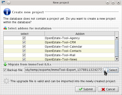 Enable the option "Backup file" and click the button "Select" to select the previously exported ZIP-archive. If no errors / problems are reported, you can click "Submit". The selected ZIP-archive will be imported into the newly created project.