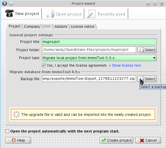 Select the option "Migrate local project from ImmoTool 0.9.x" as "project type" and click the button "Select" to select the previously exported ZIP-archive. If no errors / problems are reported, you can click "Create project". The selected ZIP-archive will be imported into the newly created project.