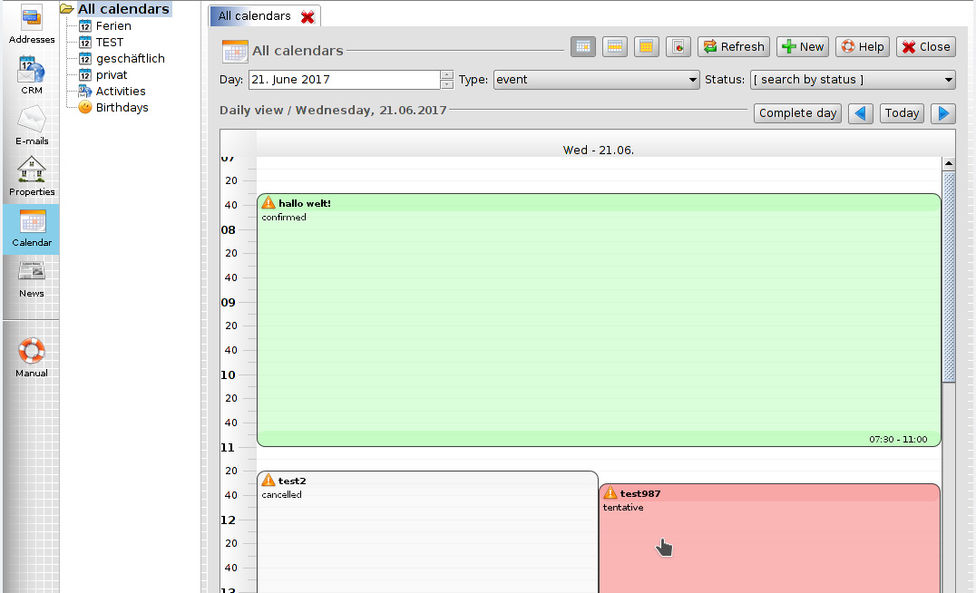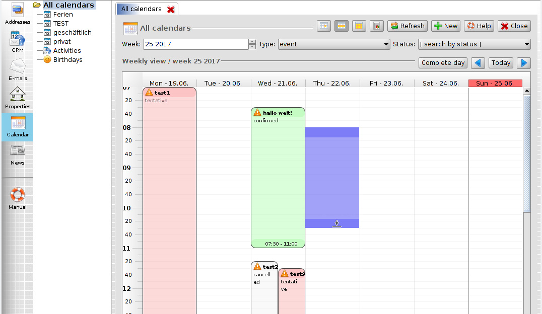 Especially the day and week view offers more flexibility and a better usability. In order to create a new calendar entry, you can mark a certain are on the day and week view. Use Drag & Drop in order to move calendar entries to another time. The new calendar views are a step forward compared to our earlier implmentation. But still this solution is not perfect. We're planning to improve the calendar views even further and publish the changes through GitHub.