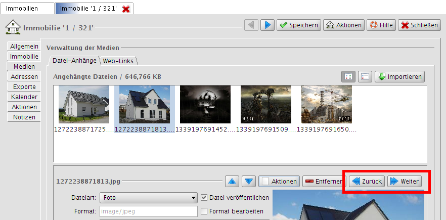Im Immobilienformular müssen derzeit die Dateien aus der Dateiübersicht einzeln angeklickt werden, wenn man diese bearbeiten möchte. Um den Vorgang etwas zu erleichtern, sollen zwei Button 'Zurück' und 'Weiter' in das Immobilienformular integriert werden. Darüber soll etwas einfacher zum nächsten / vorherigen Dateianhang gewechselt werden können.