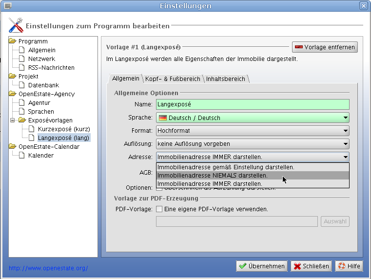 (b) Für jede Exposévorlage kann separat eingestellt werden, ob die Objekt-Adressen dargestellt werden sollen.
