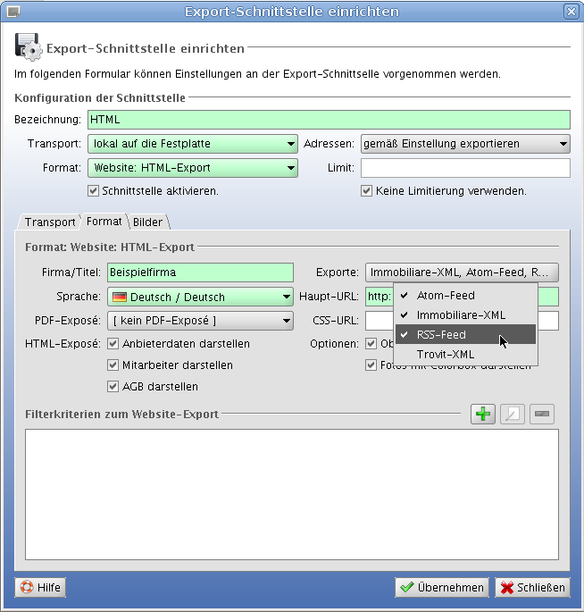 Beim HTML-Export auf die Webseite sollen analog zum Trovit-XML weitere Exportformate erzeugt werden können. Das Formular zur Einrichtung des HTML-Exportes soll dafür entsprechend umgestellt werden.