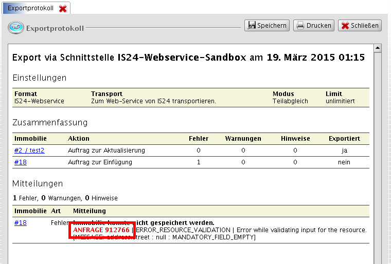 Aufgabe Ausgabe der Anfrage-Nr bei fehlgeschlagenen Übertragungen zum IS24-Webservice