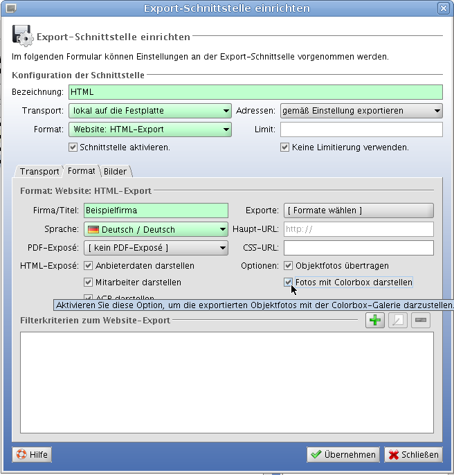 Bei HTML-Exporten sollte eine Option in den Einstellungen hinzugefügt werden: 'Galerie mit Colorbox darstellen'. Wenn diese Option ausgewählt wurde, soll zusätzlich Colorbox exportiert werden. Auf den erzeugen Exposés soll die Bibliothek entsprechend eingebunden werden.