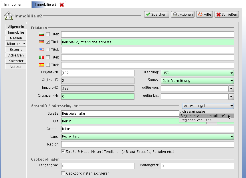 - Die regionalen Vorgaben der Portale können über eine XML-Datei in das ImmoTool importiert werden. Diese XML-Geodaten werden im OpenEstate-Wiki kostenlos zum Download angeboten.