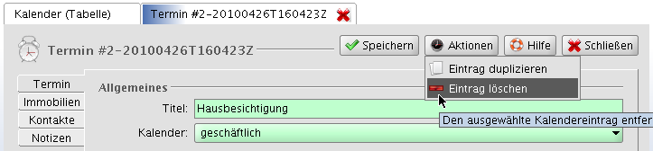 Im Immobilienformular existiert ein Button 'Aktionen'. Wenn dieser angeklickt wird, öffnet sich ein Popup-Menü mit weiteren Aktionen, die auf dem Datensatz ausgeführt werden können.