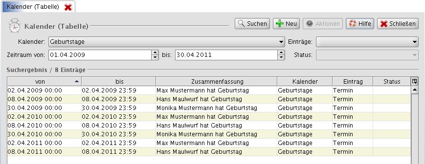 Bei der Verwaltung von Adressen soll zusätzlich ein Geburtstag hinterlegt werden können. Die hinterlegten Geburtstage aller aktiven Adresseinträge sollen in einem separaten Kalender 'Geburtstage' mit jährlicher Wiederholung dargestellt werden.