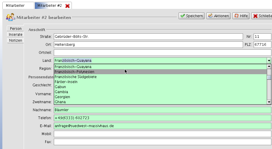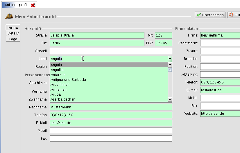 (1) Auswahl von Ländern im Anbieterprofil, bei Immobilien, Mitarbeitern und Adressen.
