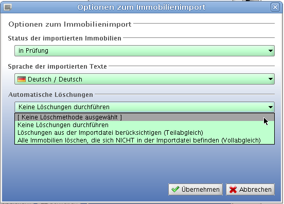 Derzeit finden beim Import von Immobilien keine Löschungen statt. Der Anwender soll beim Import die Möglichkeit bekommen, zwischen folgenden Löschfunktionen zu wählen:
