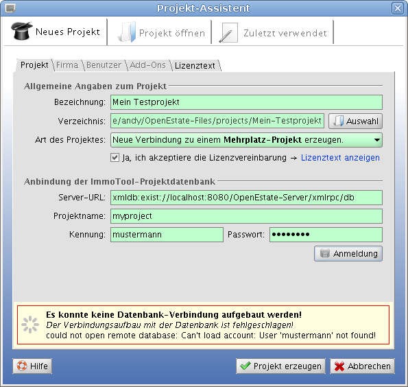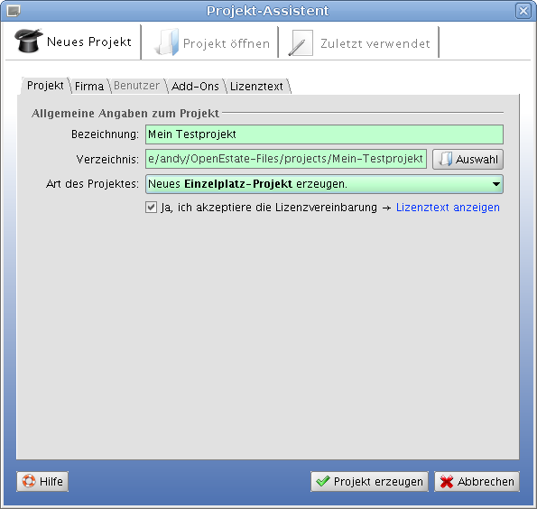 Der 'Projekt-Assistent' (Fenster zur Erzeugung eines neuen Projektes) soll an folgenden Stellen überarbeitet werden.