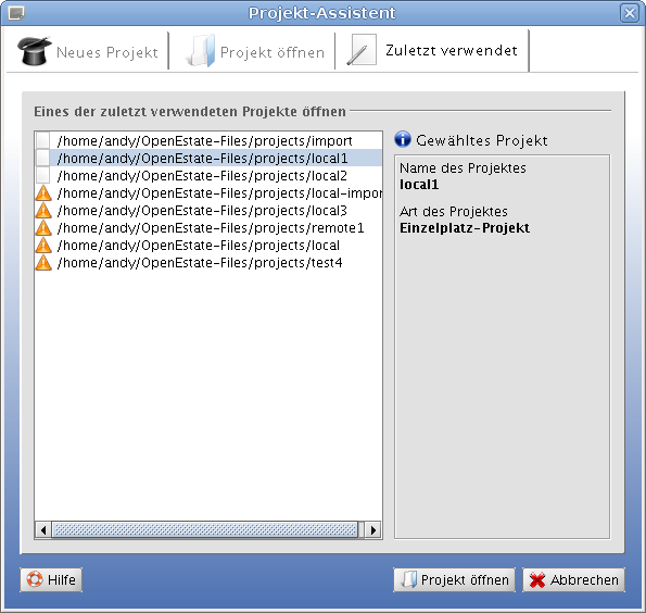 (d) Direktes Öffnen eines Projektes aus der Historie der zuletzt verwendeten Projekte.