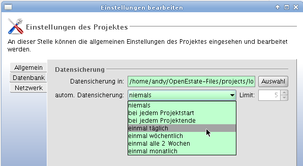 Bei der Auswahl der automatischen Datensicherung für ein Einzelplatz-Projekt wird nur noch die Option 'monatlich' angeboten. Der Darstellungsfehler soll korrigiert werden, sodass auch die anderen Optionen 'täglich', 'wöchentlich' etc. zur Auswahl angeboten werden.