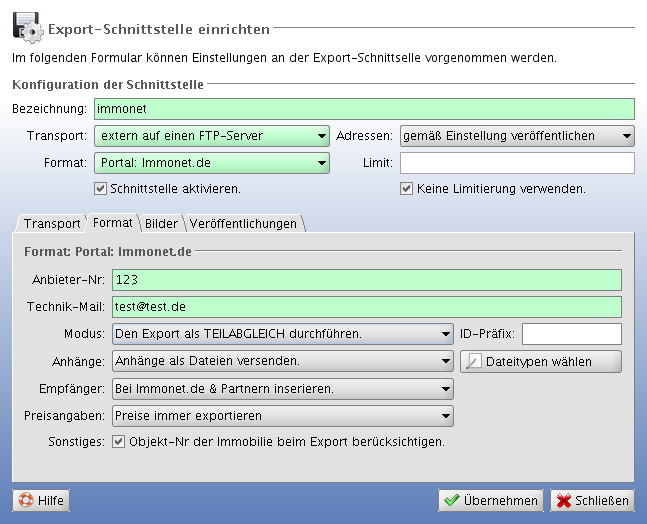 Mit der Umstellung des Immonet-Exportes von einem HTTP-Transfer auf einen FTP-Transfer ist nun auch eine Übertragung im Vollabgleich möglich. Bei der Einrichtung des Export-Formates 'Portal: immonet.de' soll entsprechend eine Auswahl zwischen Teilabgleich & Vollabgleich ermöglicht werden.