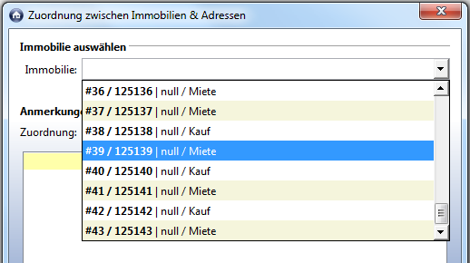 Im Dialogfenster zur Verknüpfung von Immobilien mit einer Adresse kommt es zu einer Fehldarstellung, wenn eine Immobilie ausgewählt wird. Statt des Titels der Immobilie wird immer 'null' darstellt.